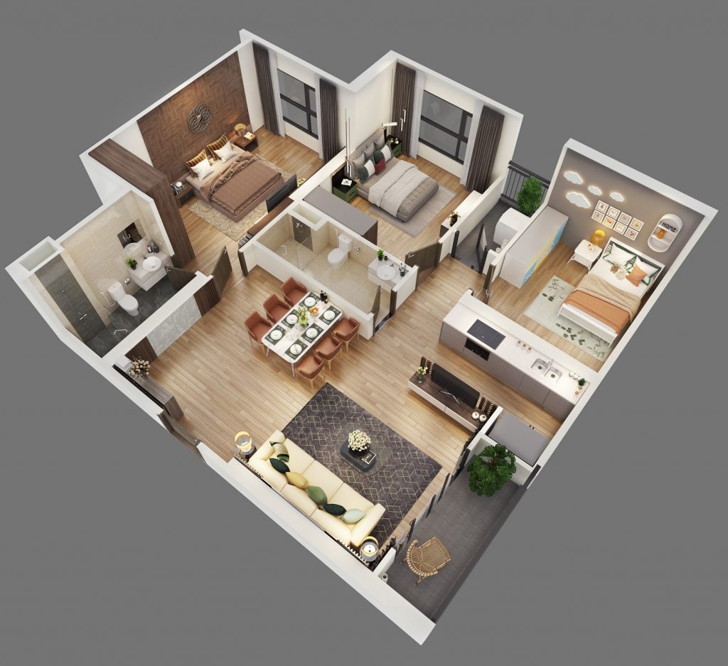• Căn 3PN (2 WC): Diện tích từ 75m2 – 94m2.